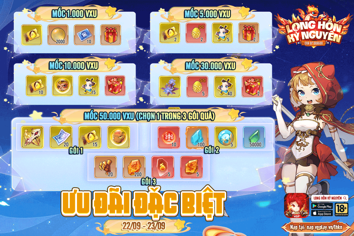- Thời Gian: 0h00 ngày 22/9 - 23h59 ngày 23/9 (Thứ 2 - Thứ 3) - Phạm vi: Toàn bộ máy chủ - Nội Dung: Trong thời gian sự kiện Tích Lũy Quy Đổi Vxu đạt mốc nhận thưởng tương ứng. Đạt mốc cao hơn có thể nhận cả thưởng mốc dưới ( Ví dụ đạt mốc 10.000 Vxu có thể nhận cả thưởng mốc 1000, 5000 và 10.000 Vxu) Đặc biệt khi tích lũy quy đổi Vxu đạt mốc cuối 50.000 Vxu sẽ tự chọn 1 trong 3 gói quà. Vui lòng liên hệ Fanpage Long Hồn Kỷ Nguyên để chọn gói khi đạt mốc. Phần thưởng cụ thể như sau: