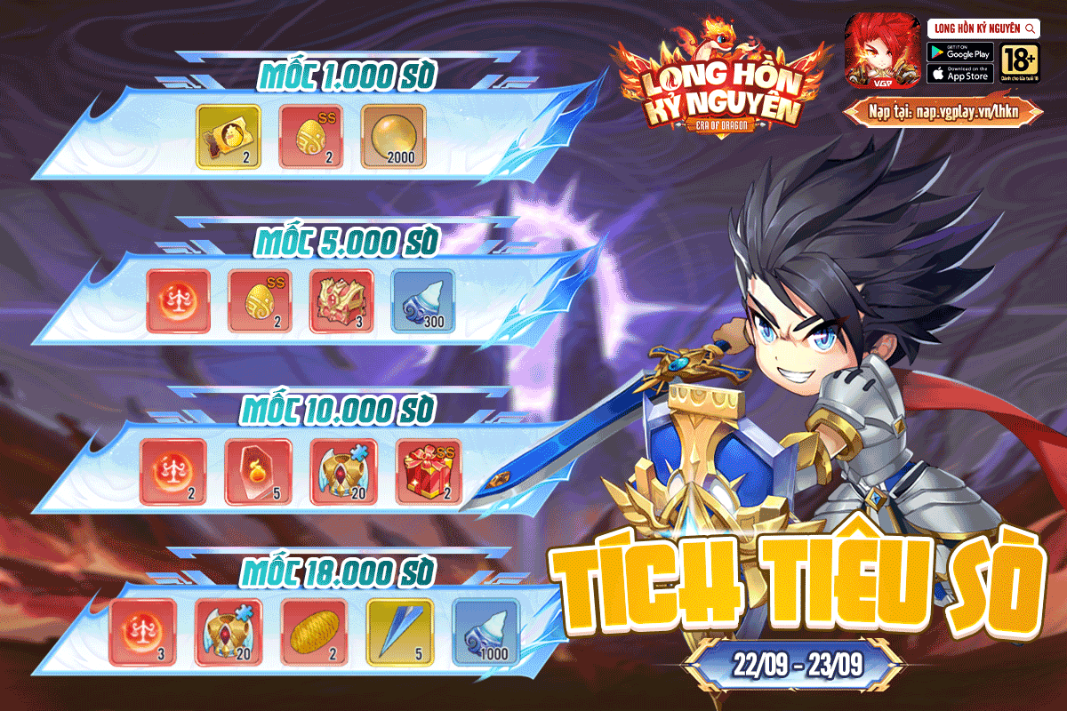- Thời Gian:0h00 ngày 22/9 - 23h59 ngày 23/9 (Thứ 2 - Thứ 3) - Phạm vi: Toàn bộ máy chủ - Nội Dung: : Trong thời gian sự kiện Tiêu Sò đạt mốc sẽ nhận thưởng tương ứng. Phần thưởng cụ thể như sau:
